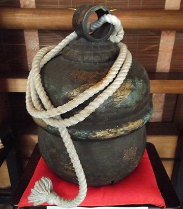 御鈴は元禄元年五月一日作製されたもので、銅板に金を埋めた名作であります。